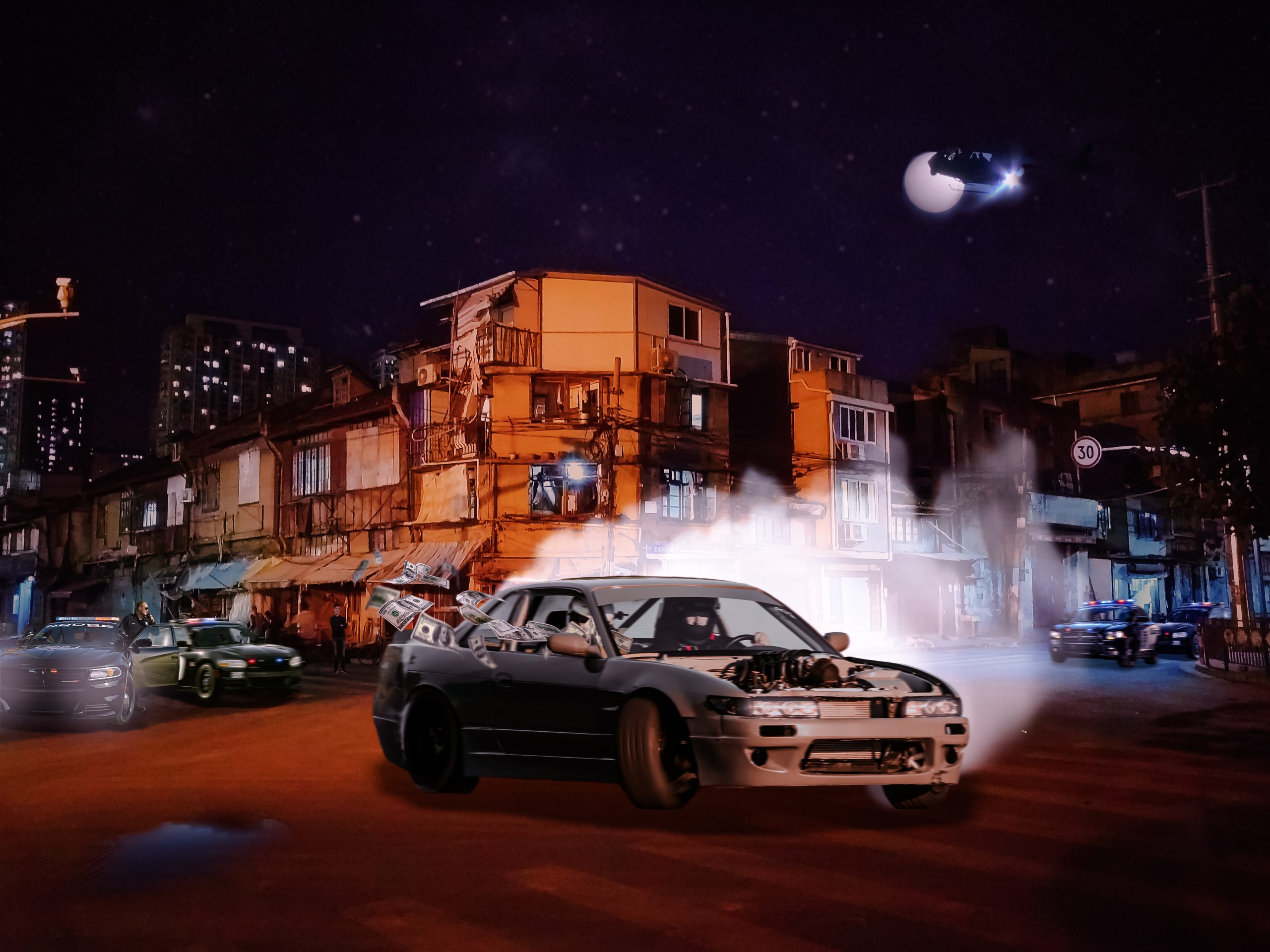Tijdens het gamen kwam er een keer een idee in me op, een “politie boefje achtervolging” maken in Photoshop. En dat heb ik dus ook gedaan. Ik begon met foto’s verzamelen en tussentijds inspiratie opdoen over wat er mogelijk was. Daarna ben ik de foto in elkaar gaan zetten. Ik ben erg tevreden met het resultaat, de politie auto’s blenden goed in en het lijkt alsof het geld echt in beweging is!