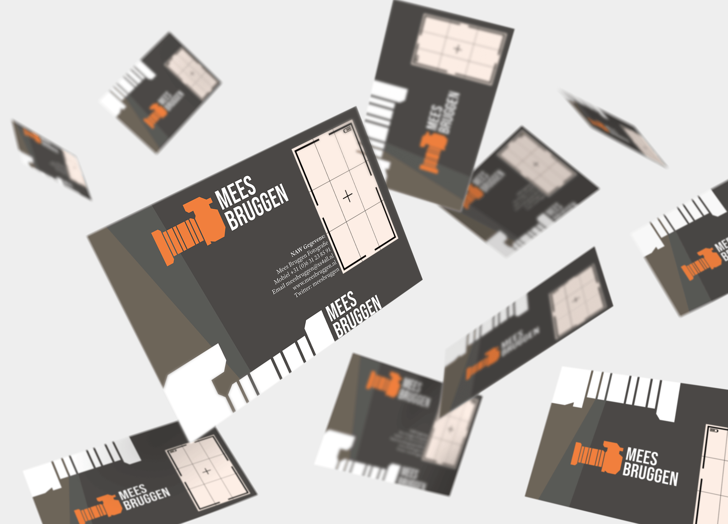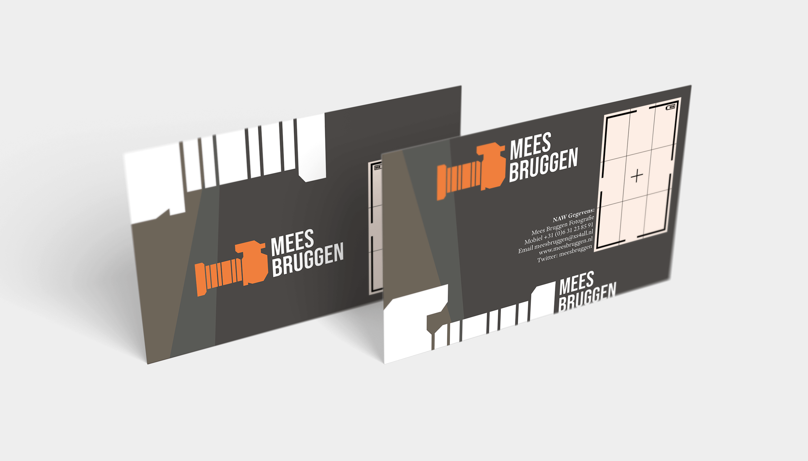 Voorkant en achterkant visite kaartje Mees Bruggen. De voorkant en achterkant sluiten op elkaar aan als je ze naast elkaar legt. Het witte vlak staat voor de grid van een camera en is doorzichtig.